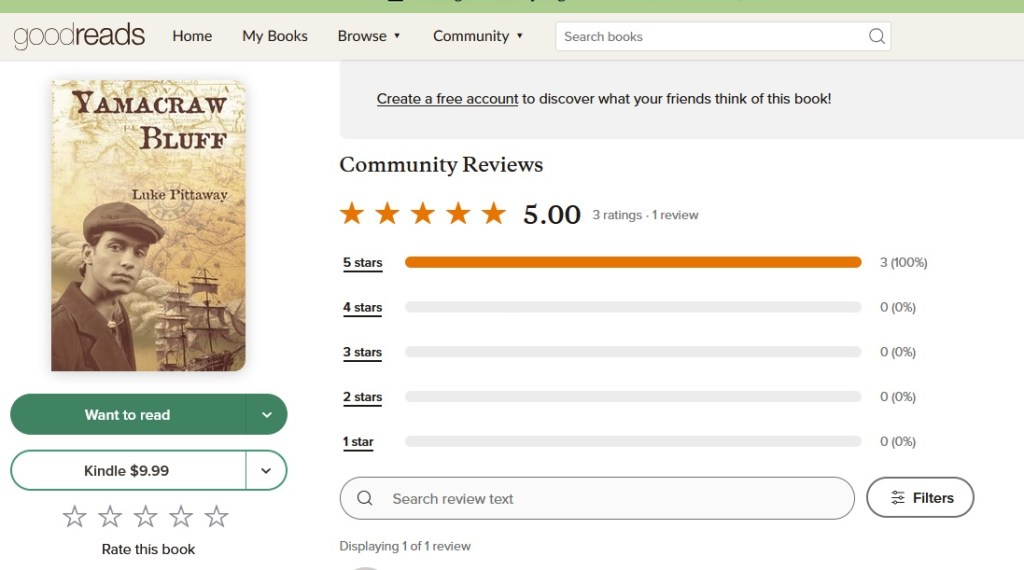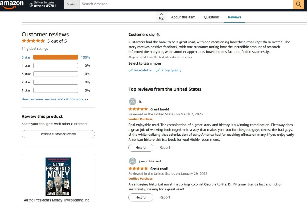 I am delighted to see book reviews for my recent historical fiction book, “Yamacraw Bluff”. So far, I’ve had 11 on Amazon and maintained a 5-star* rating. Also, pictured is my Goodreads rating, which is also 5-star. It’s great to see people enjoying my work.